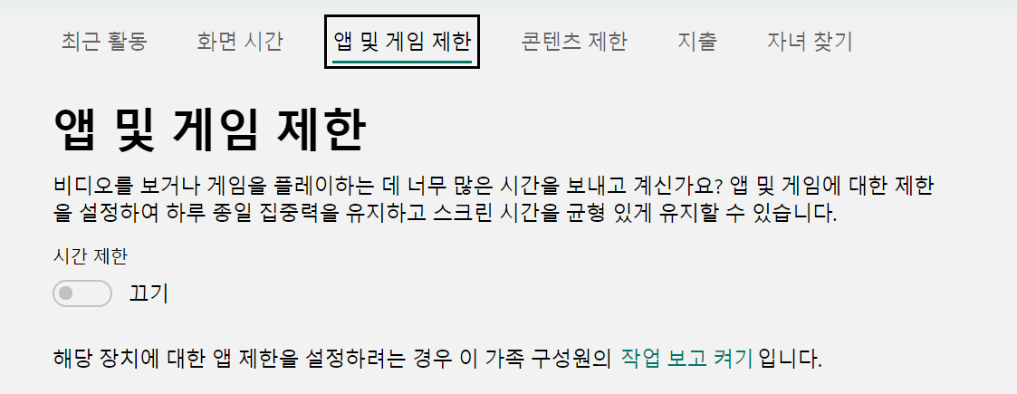앱 및 게임 제한 메뉴에서는 아래와 같이 토글 버튼이 비활성화 되어 있는데 이 버튼을 활성화하기 위해서는 초기 화면의 활동 메뉴에서 '활동 보고' 토글 버튼을 '켜기'로 활성화 해야 앱 및 게임 제한 메뉴가 활성화 됩니다.