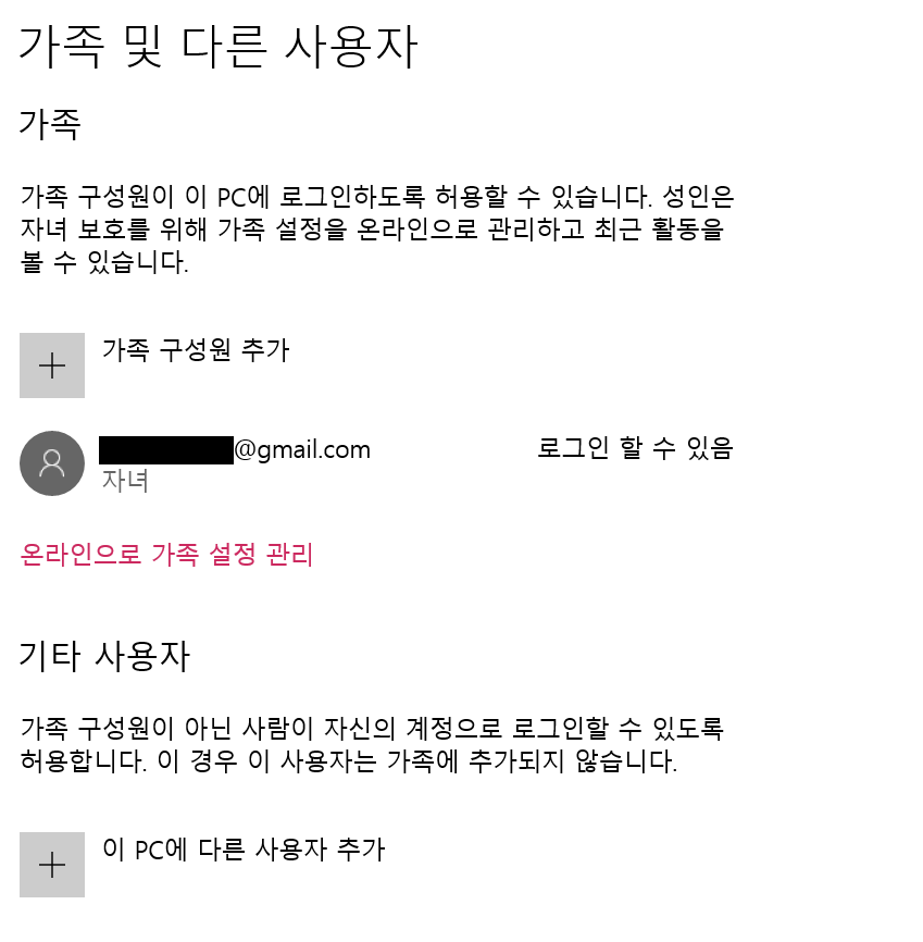 만일 컴퓨터 로그인 설정에서 로컬계정으로 로그인 하였다면 가족 구성원이 추가되지 않습니다.