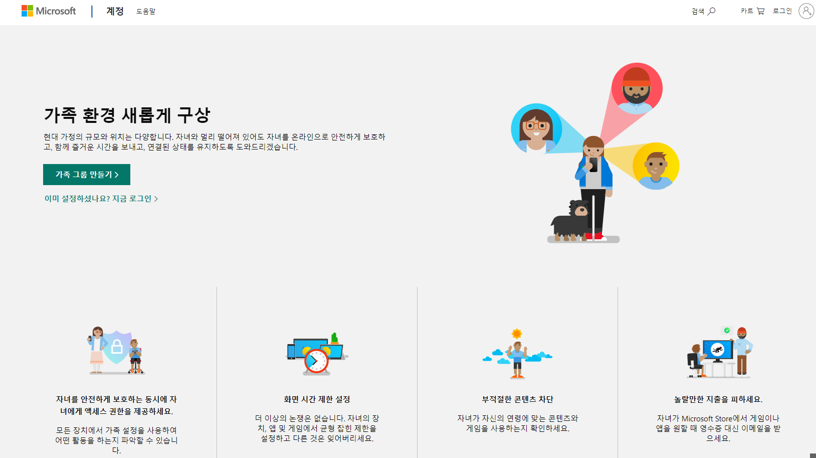 위 화면에서 '온라인으로 가족 설정 관리' 항목을 클릭하면 아래 그림과 같이 Microsoft의 '가족 그룹 만들기' 웹페이지가 로딩됩니다.