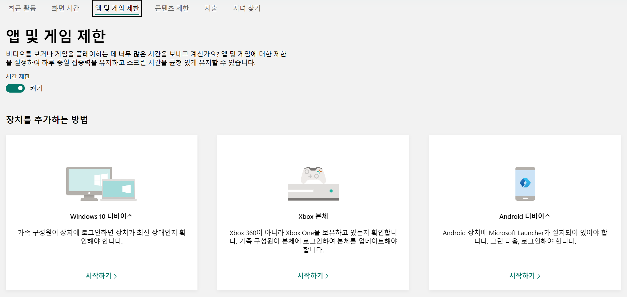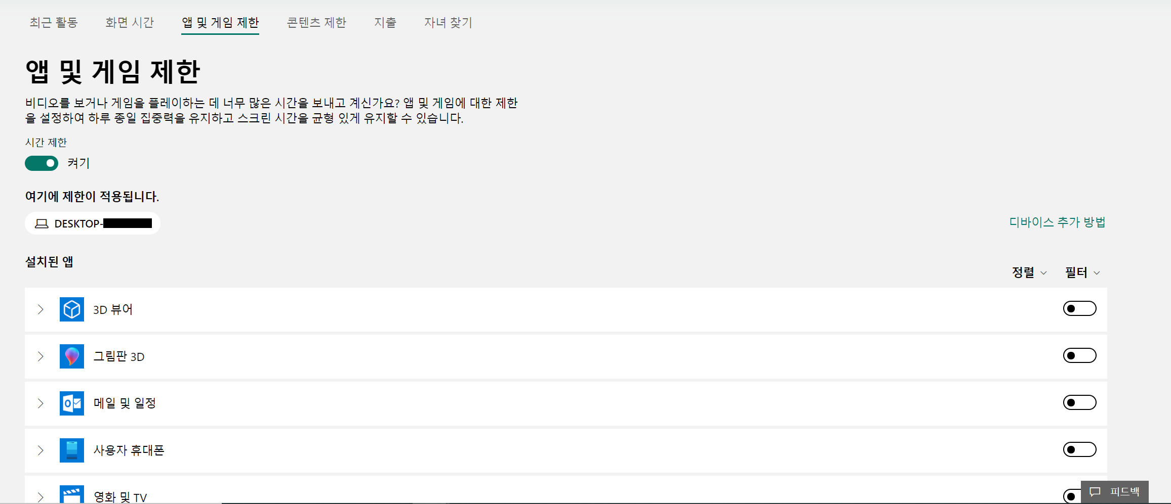 앱 및 게임 제한 항목을 활성화 하시면 아래와 같이 장치 추가 설정화면이 나옵니다.