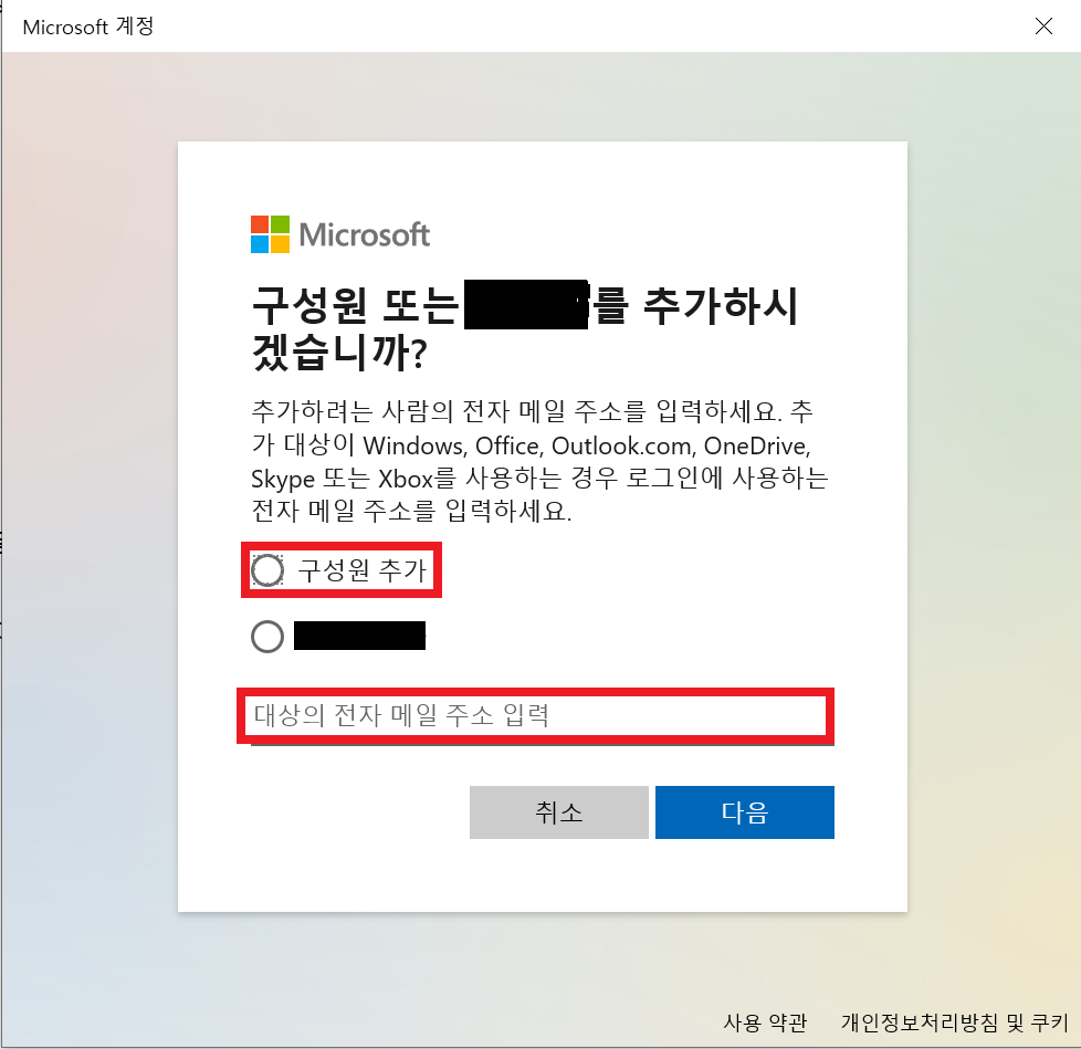 [가족 및 다른 사용자] 화면에서 [가족 구성원 추가]를 클릭하면 아래와 같은 창이 나오고 여기서 구성원 추가를 선택하고 추가할 구성원의 Microsoft 로그인 계정을 입력해 줍니다.