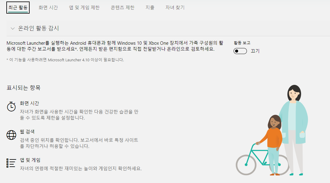 활동을 클릭하시면 최근 활동에 대한 '끄기<=>켜기' 토글 버튼이 나오고 '켜기'를 선택하시면 자녀의 온라인 활동을 주간 보고서로 받아보실 수 있습니다.